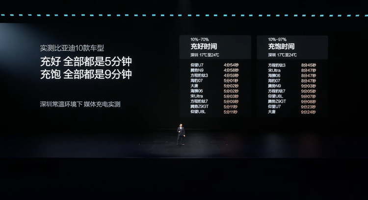 最炸的,还是和闪充技术的配套。很多人之前对快充有个固有认知:快充越快,电池衰减越厉害,鱼和熊掌不可兼得。但比亚迪这次直接打破了这个魔咒,第二代刀片电池专门打造了“锂离子高速通道”,从正极、电解液到负极,全链路优化了锂离子的传输路径,让快充时电池内部产热直接降了50%。配合全域1000V高压平台和自研碳化硅芯片,最终实现了行业想都不敢想的成绩:常温下10%到70%充电只用5分钟,10%到97%充满只用9分钟,就算是零下30℃的极寒环境,从20%充到97%也只比常温多3分钟。