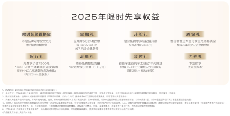 6.88万起的亲民价格,加上3月限时超级置换金、金融礼、升舱礼、质保礼、智行礼、流量礼、交付礼、优先礼等多重限时先享权益。让很多家庭增购第二台车时毫无压力。