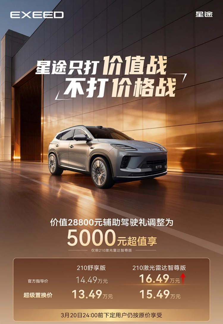 车家号·0浏览·2026-03-09 16:24 · 北京3月5日,奇瑞汽车旗下高端品牌星途官宣涨价,将旗下 星途ET5(参数|询价)210激光雷达智尊版的指导价上调5000元,调整后售价16.49万元,星途由此成为今年国内首个官宣涨价的汽车品牌。据大河汽车报道,星途销售人员称此次涨价主要是智驾权益部分,也可以选择其他版本。该销售人员进一步解释称,星途ET5去年11月上市时,官方承诺高配的210激光雷达智尊版可免费使用猎鹰700城区智驾,原价值28800元,现在需要额外支付5000元才能获得,内含地平线征程6P芯片、猎鹰700高阶智驾系统等,售价因此由15.99万元上调至16.49万元。
