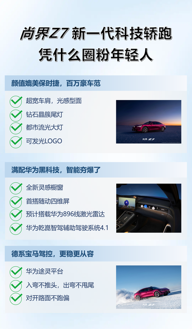 归根结底,一款科技轿跑的真正价值,终究体现在其陪伴用户全生命周期的可靠性、智能性与安全性上。尚界Z7摒弃冗余噱头,将技术重心牢牢落位于这些长期影响用户体感的核心维度,在智能、安全、操控三大领域建立起鲜明的差异化竞争优势。对于追求前沿科技体验、渴望拥有一台高品质第一台科技轿跑的年轻人来说,尚界Z7凭借华为全栈黑科技的加持,无疑是最优解之一,用硬核技术诠释科技轿跑的真正内涵。