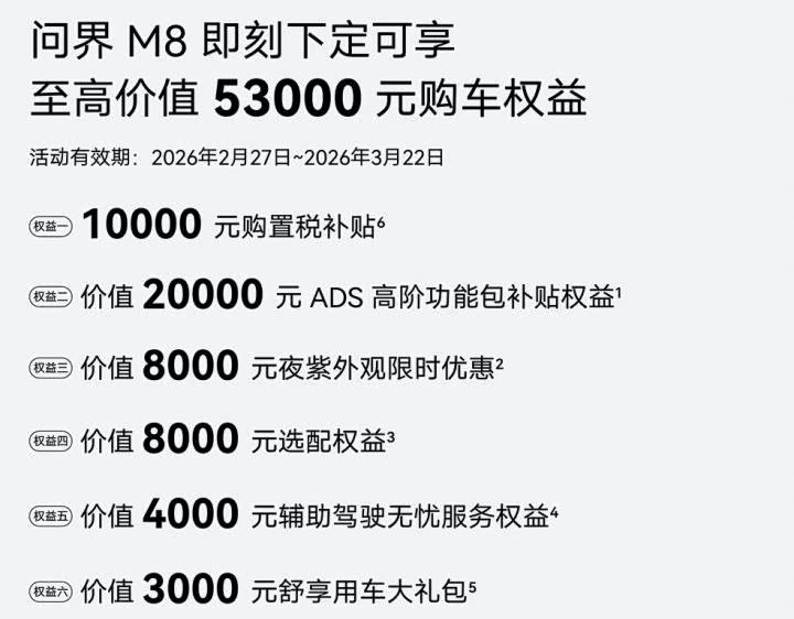 车家号·0浏览·2026-03-09 16:44 · 北京近日,问界针对M8推出限时优惠活动,包括1万元购置税补贴和4000元辅助驾驶无忧服务权益等,总价值5.3万元。