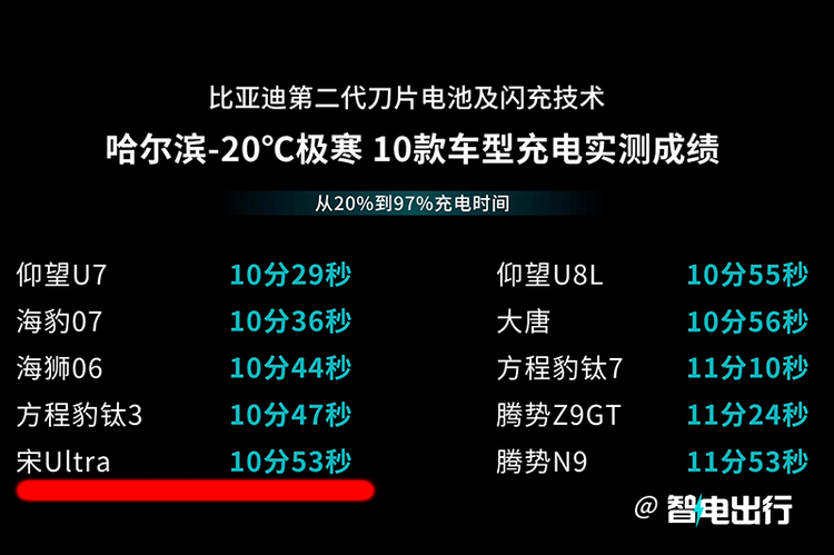 新车全系搭载比亚迪第二代刀片电池和新一代闪充,没错是全系标配!比亚迪集团董事长兼总裁王传福将70%电量定义成充好,97%的电量是充饱。宋Ultra在深圳常温环境下充电从10%-70%最快只要5分03秒,即便是在-20°C的环境,从20%充到97%也只需要10分53秒。这个补能速度对东北、西北等寒冷地区的朋友来说是重大利好。