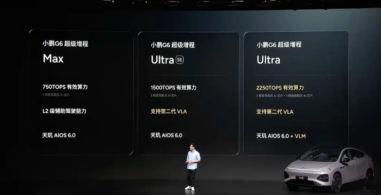 智能化配置依然是小鹏G6超级增程版的发力点,新车搭载了小鹏第二代VLA智能驾驶系统,其中Ultra和Ultra SE版将在4月推送全量更新,Max版则计划在下半年推送。硬件方面,三个版本分别搭载1颗、2颗和3颗图灵AI芯片,算力从750TOPS到2250TOPS不等。智能座舱则采用MT8676芯片,支持天玑AIOS 6.0系统,预计系统运行将拥有流畅高效的操作体验。