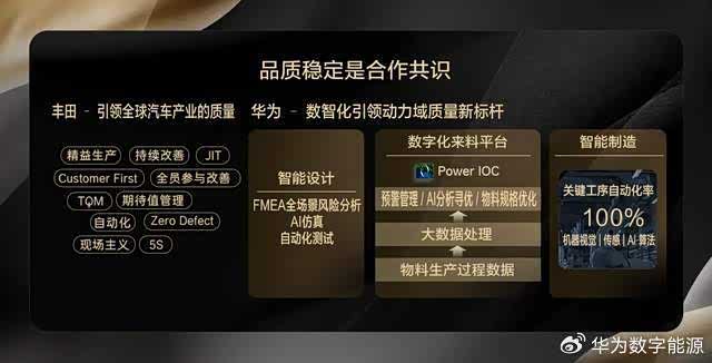 华为与丰田的合作,始于对“品质、稳定、安全”的深度共鸣。丰田凭借产品“靠谱”的口碑,赢得无数消费者的信赖,其精益生产、持续改善、品质优先的质量管理理念,成为全球企业追求高质量发展的共同财富。华为通过数字化能力的加持,从设计,到来料,再到制造,构建了一套端到端的华为智能电动质量体系: 在设计端结合全场景风险分析与AI仿真等技术,设计预设失效模式,把安全风险消灭在设计阶段;来料环节依托深度的原子工艺赋能与可视化过程的数据管理,实现物料生产过程风险预警;在制造环节,丰田严苛的品质管理流程加上华为的自动化产线、AI品控和数字化制造能力,实现造一台车和造N台车品质如一。