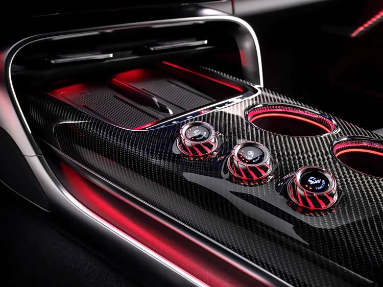 中控台中央通道区域设置了三个带LED刻度标识的物理旋钮,分别用于调节Response Control控制动力响应(电门踏板响应特性)、Agility Control控制过弯特性(转向灵敏度)、Traction Control控制牵引力介入程度,设有9级可调,这套系统被称为AMG RaceEngineer(或AMG TRACK PACE虚拟赛道工程师),可记录80项遥测数据,频率达10次/秒。