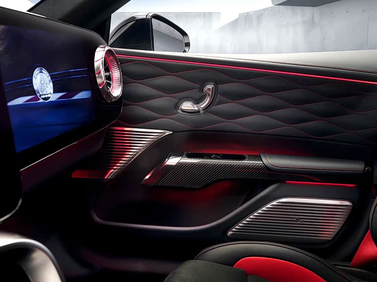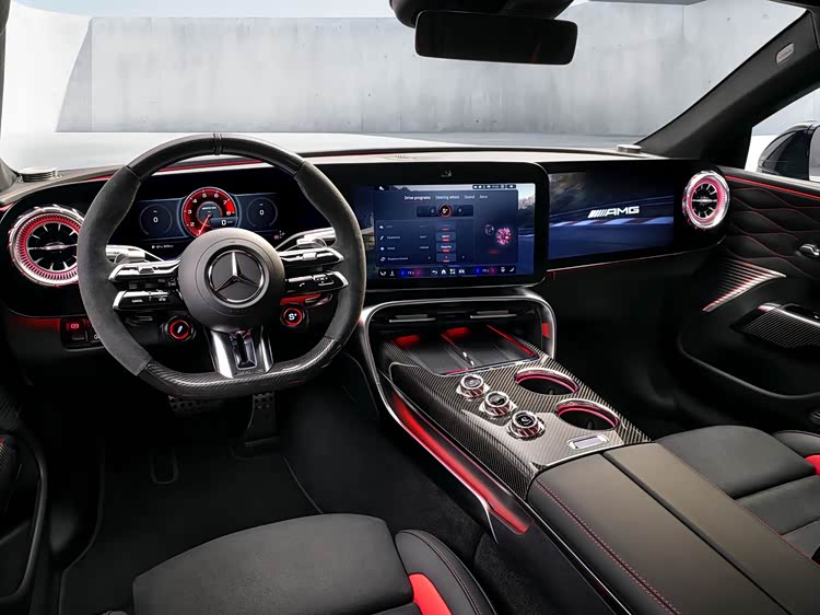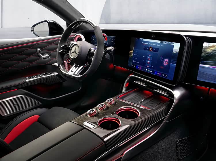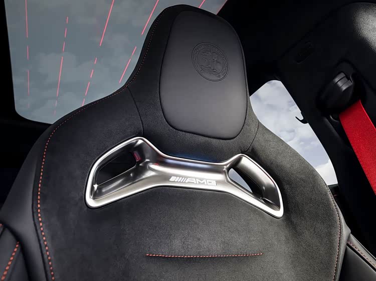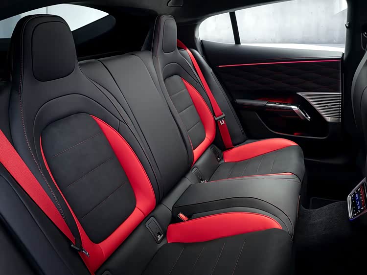 前排配备AMG高性能座椅,采用低坐姿和轻量化设计。后排座椅提供两种布局选择,标配两个独立座椅,地板设有凹槽以增加腿部空间;选装三座长椅,但因中央通道隆起较高,中间乘员腿部空间受限,后排乘客配备独立小型服务屏,用于调节空调等功能。