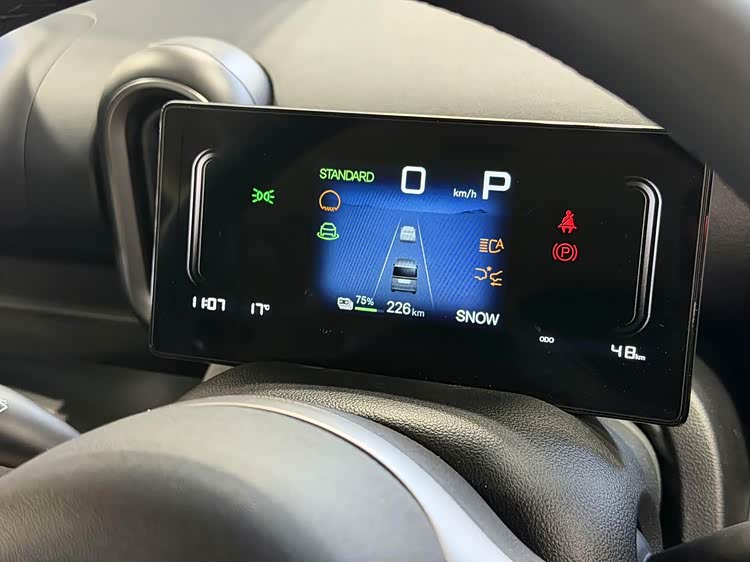 内饰部分,中控台造型简约立体,使用了悬浮式的仪表盘和中控屏,三幅式方向盘造型很别致。从其仪表盘中显示的信息可以看出,电池75%的电量续航里程为226km,可以算出其满电续航里程为300km。