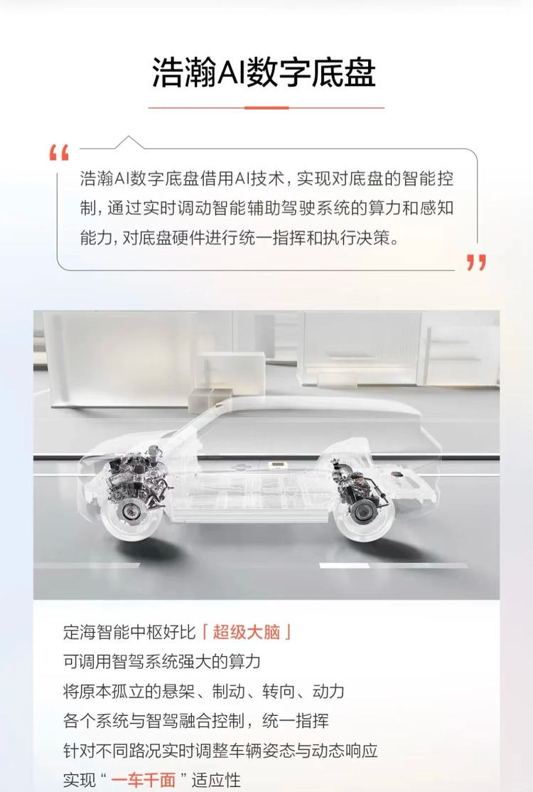 操控的极致表现,离不开底盘系统的强力支撑。极氪8X搭载浩瀚AI数字底盘,配合双腔空气悬架、CDC可变阻尼减振器和48V主动稳定杆,能有效抑制过弯侧倾,兼顾赛道级操控与日常舒适性。这套底盘系统由中欧专家联合调校,能根据车速、路况、驾驶模式实时调整悬架刚度与阻尼,过弯时主动抑制侧倾,让车身姿态更平稳;经过颠簸路面时,过滤细碎震动,提升乘坐舒适性,真正做到“运动不颠、舒适不晃”。