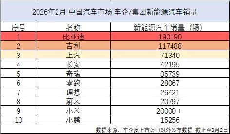 2026年伊始,中国新能源汽车市场的竞争态势愈发清晰。依据车企及上市公司公开披露的数据显示,比亚迪2月份新能源汽车销量达到190190辆,再度斩获行业销量桂冠!
