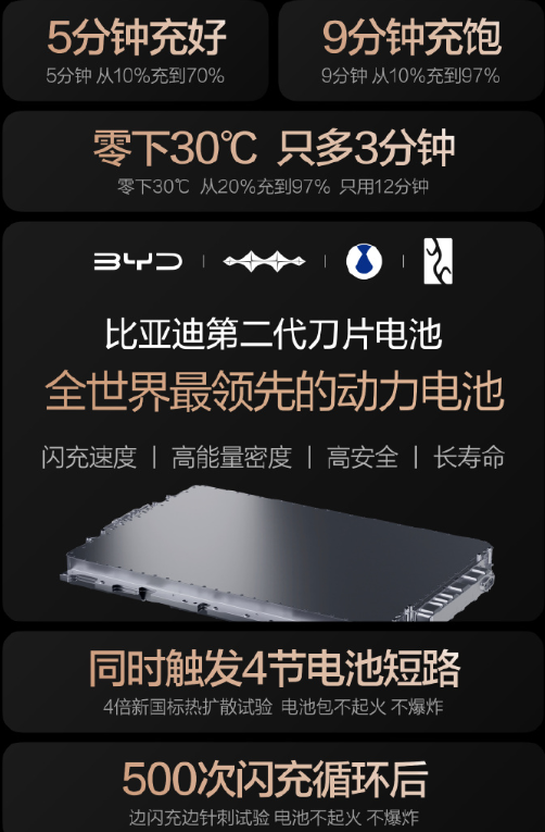 可能大家并不太清楚500次闪充循环是什么概念?换算一下,差不多电车已经能够行驶30万公里了,这真的是非常硬核了。一般来说,家用车每年行驶的里程差不多是1万公里,可以理论行驶30年!电池的寿命是远远超过汽车本身寿命的,所以长期用闪充是几乎不影响电池安全的,也不影响电池寿命!比亚迪二代刀片电池具有高能量密度、长寿命、高安全的优点,所以说比亚迪的硬核闪充技术树立行业新标杆确实没毛病。