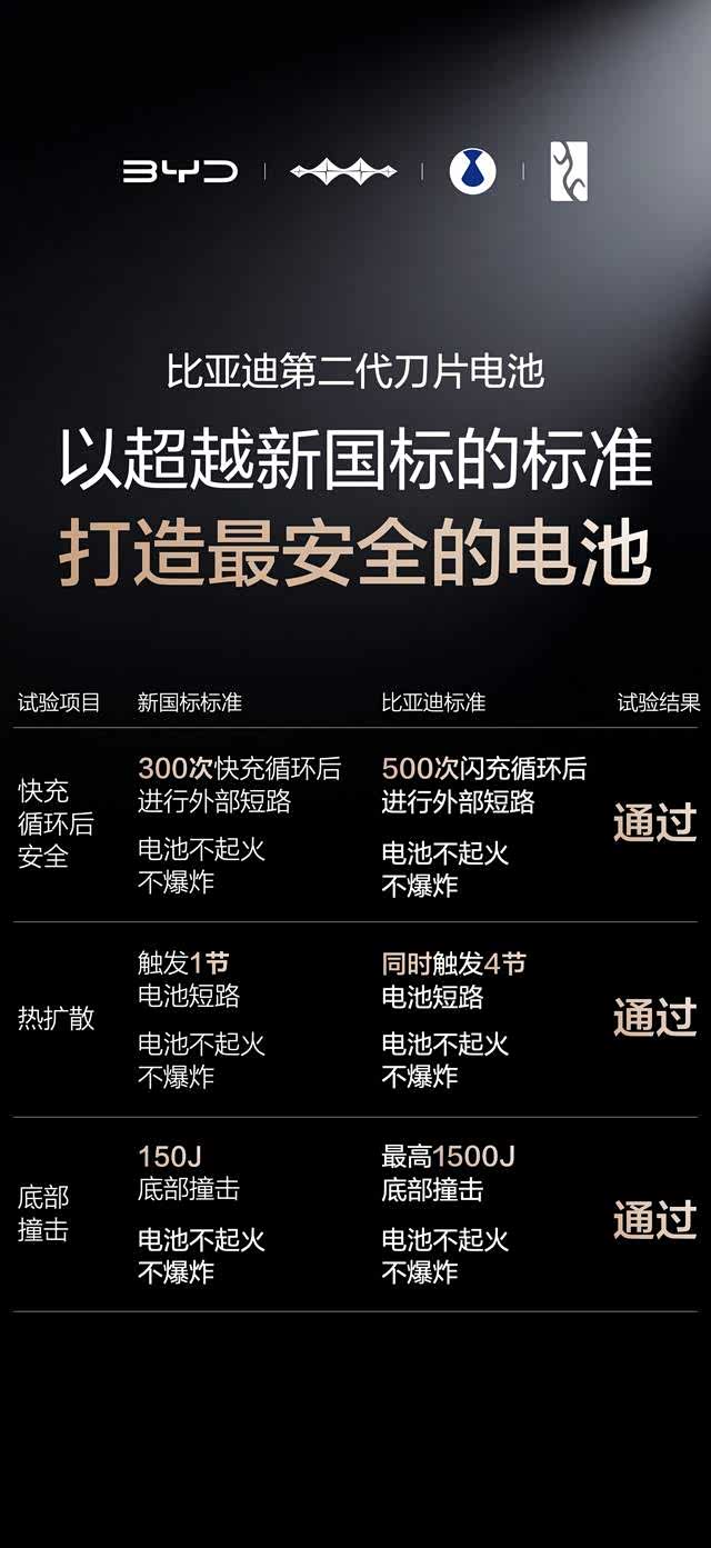 安全是新能源汽车的生命线,比亚迪第二代刀片电池在安全性方面同样表现出色。它通过了一系列远超新国标的严苛安全试验,包括500次闪充循环后的边闪充边针刺试验、热扩散试验以及底部撞击试验等。在这些试验中,第二代刀片电池均展现出了卓越的安全性能,即使在极端情况下也能确保不起火、不爆炸,为用户的行车安全提供了坚实保障。