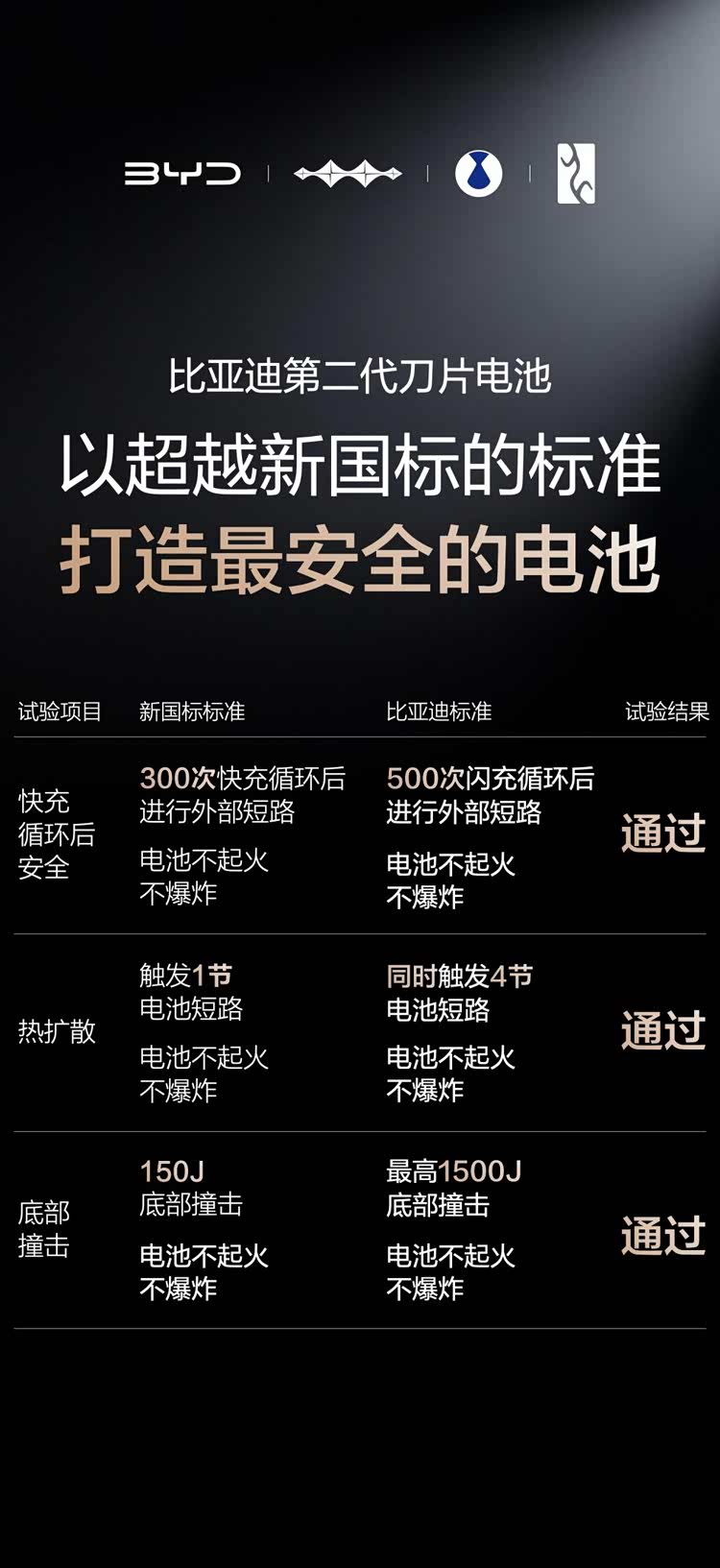 安全,始终是比亚迪刀片电池的核心底色。第二代产品通过了一系列远超新国标的严苛测试:500次闪充循环后边充边针刺,无热失控、无起火冒烟,相当于15年用车依旧安全;同时触发4节电池短路的热扩散试验,周边电芯安然无恙;10倍新国标能量的底部撞击测试,电池包依旧稳定。这一系列测试,不仅印证了闪充不影响电池安全,更展现了比亚迪在电池安全领域的绝对领先。
