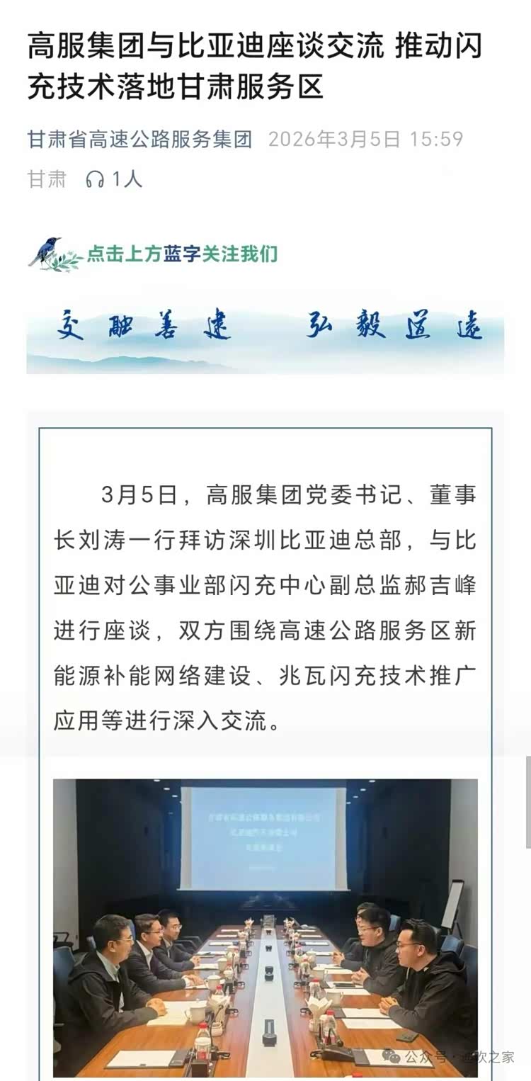 目前已有多地的高速公路集团主动拜访比亚迪,寻求闪充服务区的合作,想要借助这一技术完善高速出行的补能网络。