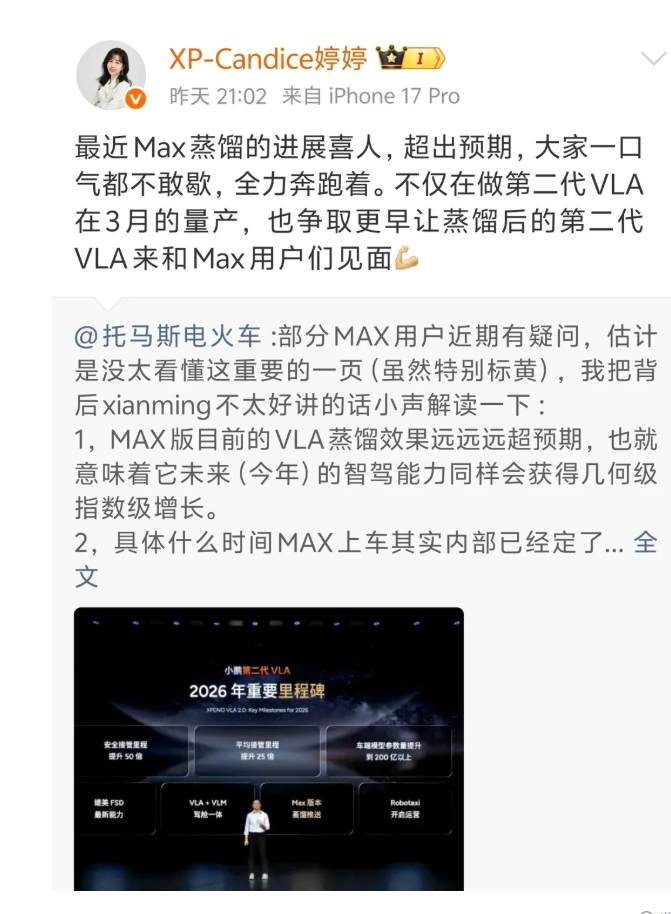“不要着急!小鹏 Max 蒸馏正在全力做”,一句简单的回应,让众多小鹏 Max 版车主吃下定心丸,也让市场看到小鹏在智驾技术下放与老车主权益保障上的满满诚意。小鹏正全力推进的 Max 版智驾蒸馏,核心是将行业领先的第二代 VLA 智驾技术,通过云端知识蒸馏技术适配至 Max 版车型,让搭载单颗图灵芯片或双 Orin-X 芯片的 Max 版车型,也能享受到接近 L4 级的高阶智驾体验,这一操作不仅是小鹏智驾技术的又一次落地,更成为新能源行业智驾技术跨硬件下放的新标杆。