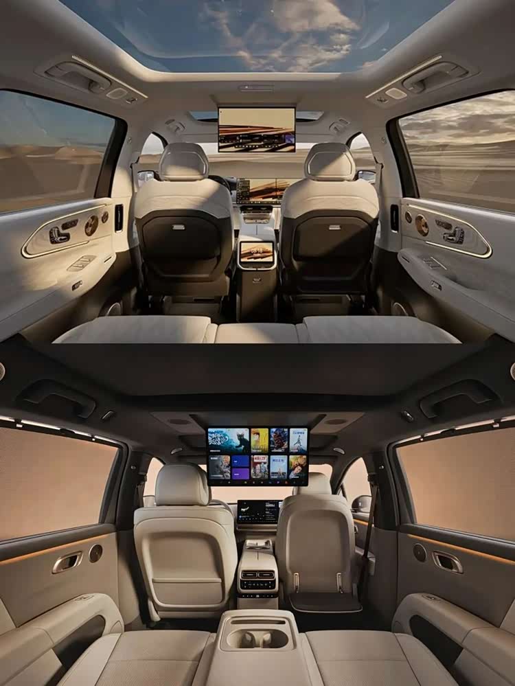 魏牌V9X是这三款车型中尺寸最大的,长宽高分别为5299/2025/1825mm,轴距为3150mm。动力上搭载2.0T插混系统,申报信息显示纯电续航有240km和363km两种规格。内饰上,魏牌V9X同样配备了理想同款的副驾双联屏,同时提供悬浮式液晶仪表和AR-HUD等配置。该车采用2+2+2的6座布局,第二排座椅提供躺椅模式,搭配二排可翻折娱乐屏,大大提升后排乘客的舒适度。另外,二排扶手处还有手机无线充电功能。
