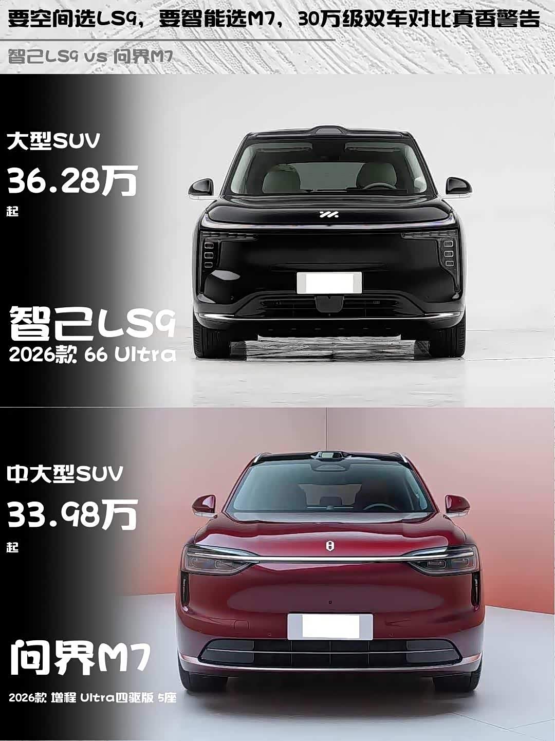 最近在选增程式SUV的朋友看过来! 智己LS9(参数|询价) 2026款 66 Ultra和问界M7 2026款 增程 Ultra四驱版 5座深度对比,看完这篇你就知道怎么选了!🚗💨