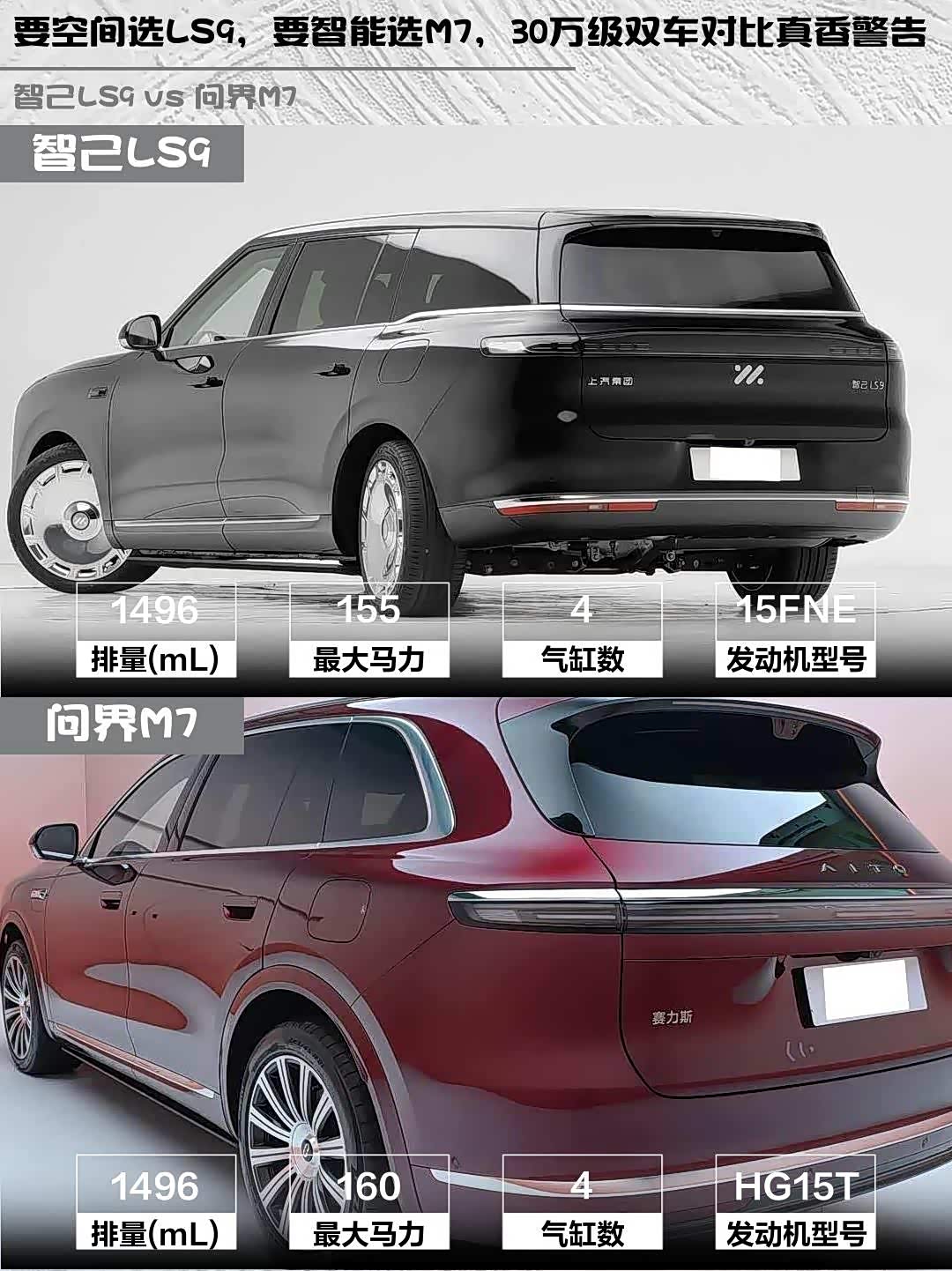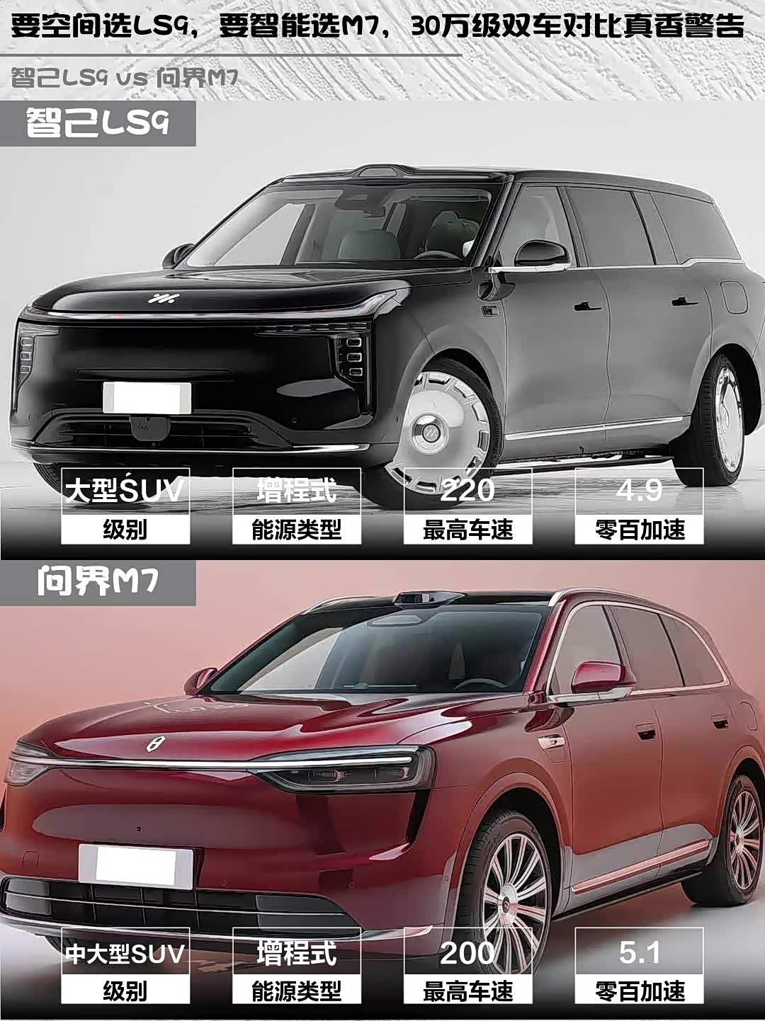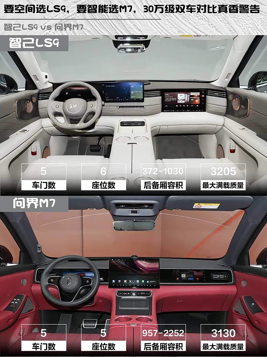 总结:要空间豪华选智己LS9,要智能生态选问界M7。两款都是30万级性价比王者,试驾记得重点体验后排舒适度和车机流畅度!
