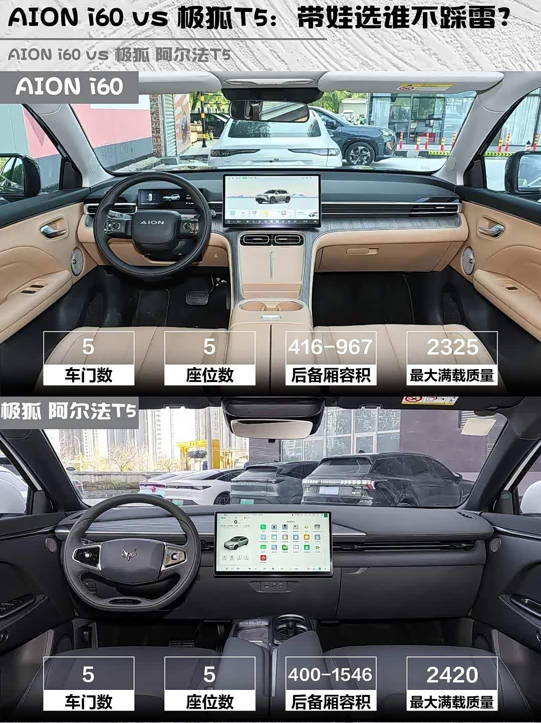 1️⃣ 空间灵活性:AION i60后备箱常规容积416L,放倒座椅能扩展到967L,露营装备随便装;阿尔法T5后备箱常规400L但拓展后能达到1546L,更适合搬运大件。不过AION i60后排靠背支持137度调节,长途乘坐更舒服。