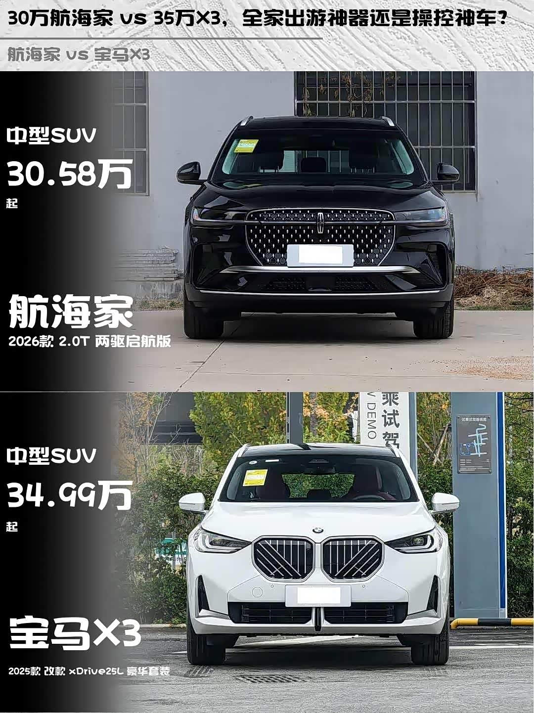 最近在纠结航海家2026款2.0T两驱启航版和宝马X3 2025款改款xDrive25L豪华套装的朋友看过来!深度对比干货送上👇