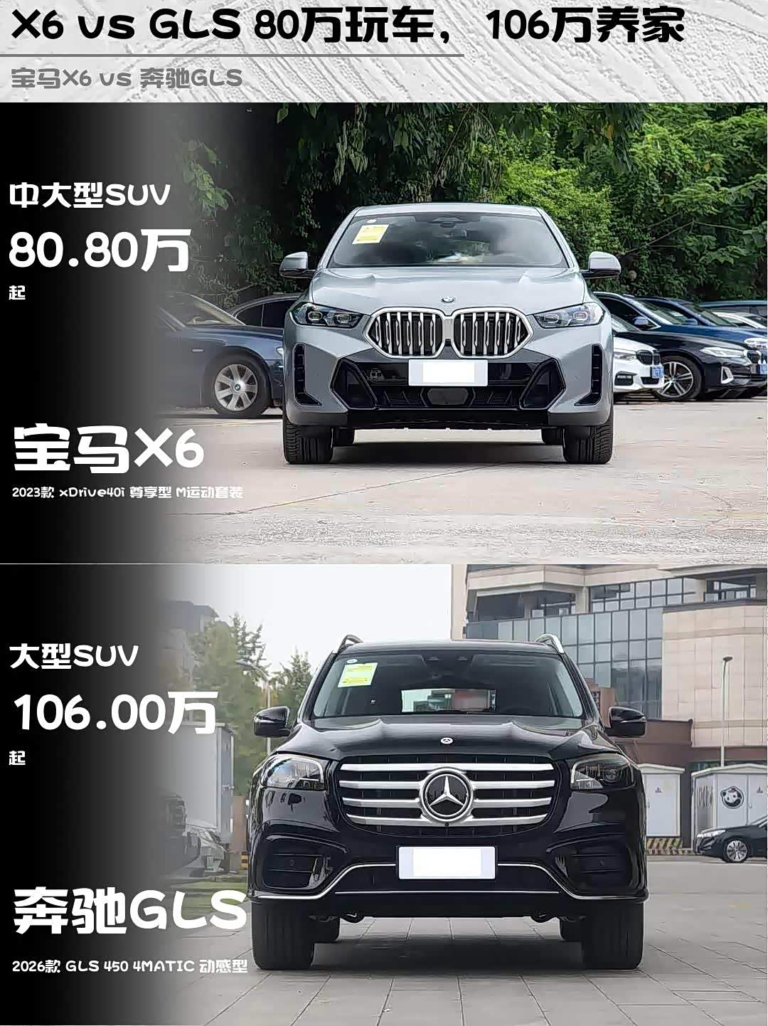 最近后台好多人在问宝马X6和 奔驰GLS(参数|询价)怎么选?作为两款百万级豪华SUV,其实定位差异挺大的!今天就来聊聊这两台猛兽的硬核对比,看完你就知道该冲哪台了~ 🚗💨