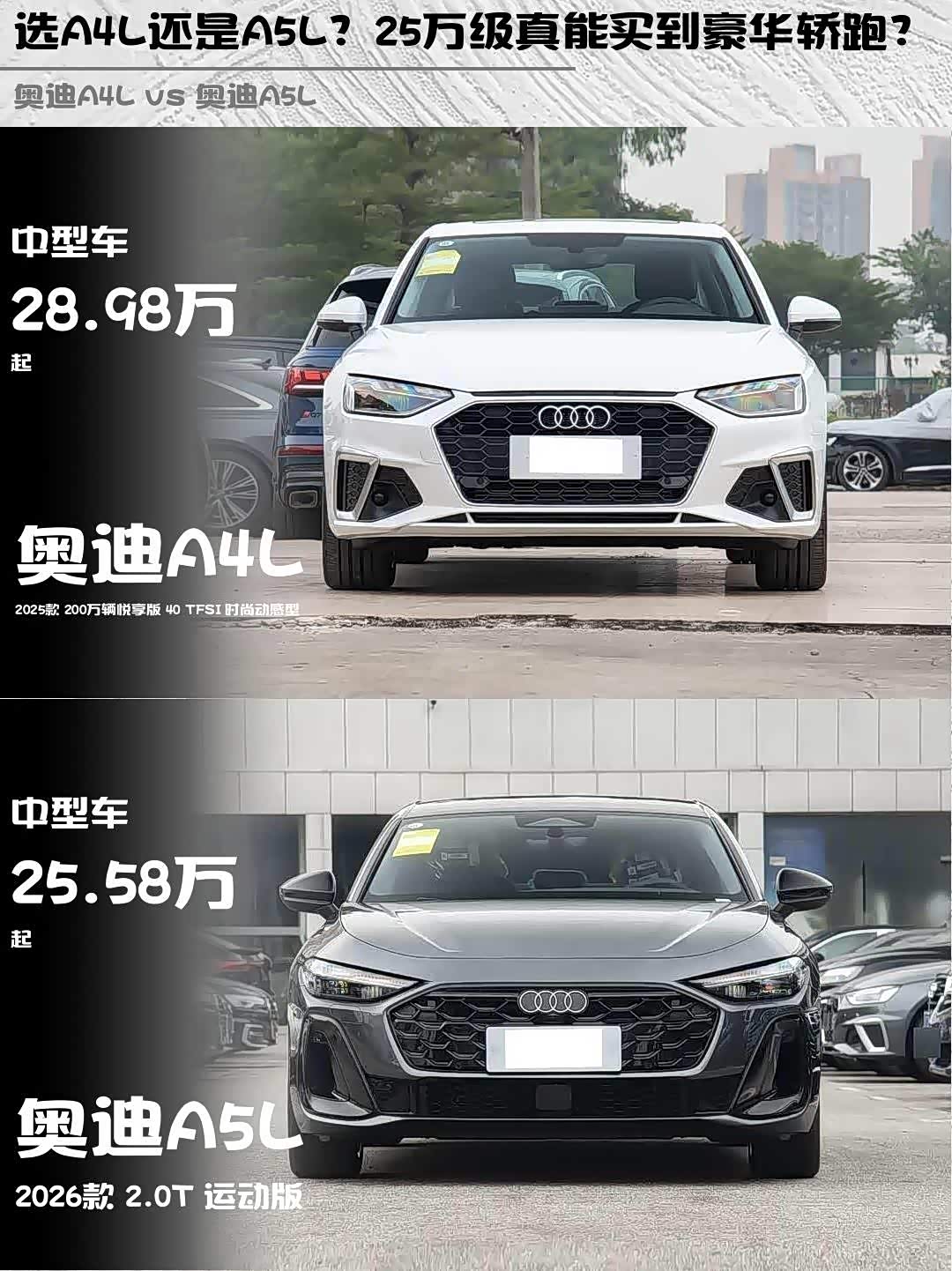 最近后台好多人在问2025款奥迪A4L 200万辆悦享版和2026款奥迪A5L 2.0T运动版到底该选谁?作为开过两款车的"老司机",今天就从5个维度给大家深度解析👇