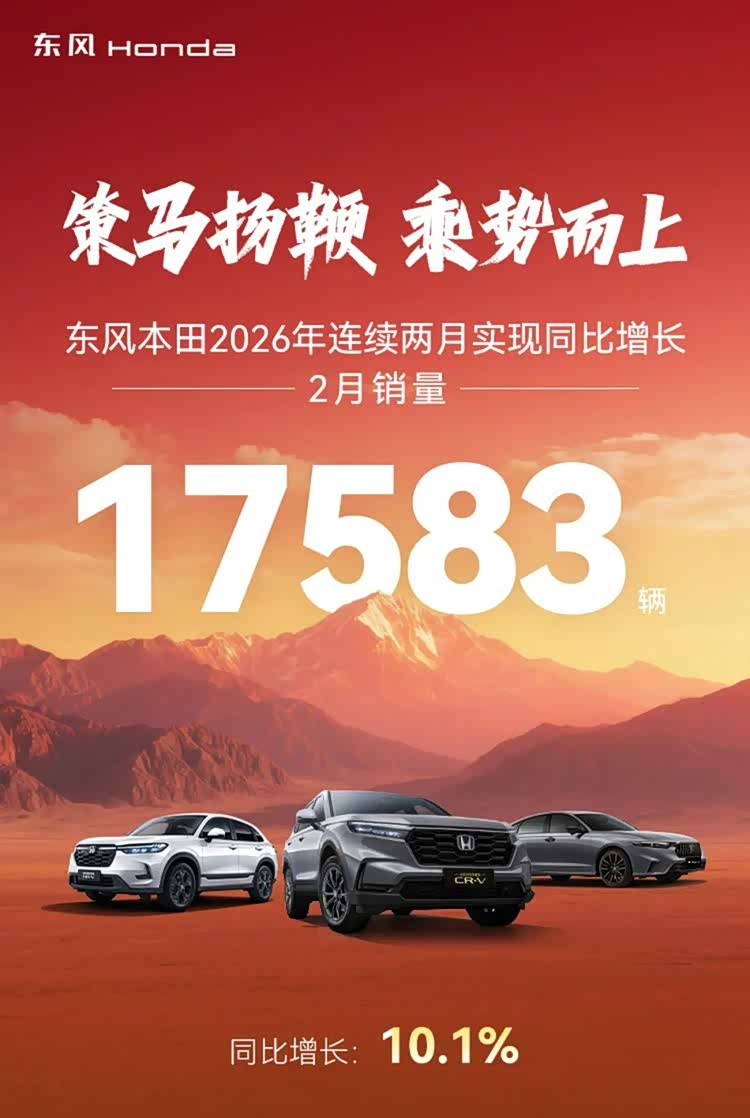 危局之中,东风本田却交出了一份逆势突围的答卷——1月销量31377辆、同比增4.4%;2月17583辆、同比增10.1%,成为少数实现连续正增长的合资品牌。