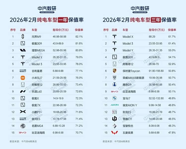 在市场竞争日趋白热化的当下,车辆的保值能力已成为消费者购车决策的重要考量。中国汽车流通协会发布的《2026年2月中国汽车保值率研究报告》显示,一年车龄的纯电车型保值率榜单中,问界M9以82.1%高居榜首,紧随其后的分别是极氪009(81.6%)和 理想MEGA(参数|询价)(80.8%)。这3款车型均定位高端市场,在保值率上形成第一梯队。反观三年车龄纯电榜单,保值率整体回落明显。特斯拉Model X、Model 3分别以61.7%和61.4%的保值率较靠前,而极氪009(54.1%)、阿维塔12(52.9%)等新势力车型,虽然一年保值率表现不错,但三年保值率下滑显著。