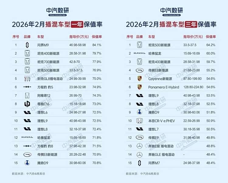 插混车型一年车龄榜单中,问界M9以84.1%的保值率再次登顶;坦克400、500新能源(79.7%、76.9%)、方程豹豹5(74.9%)等硬派越野插混车型表现亮眼。三年车龄中,插混车型的保值率整体也出现下滑,不过坦克500新能源依然以64.2%的保值率领跑;海外品牌如保时捷Cayenne新能源(54.6%)、Panamera E-Hybrid(54.6%)等,均被部分自主车型超越。