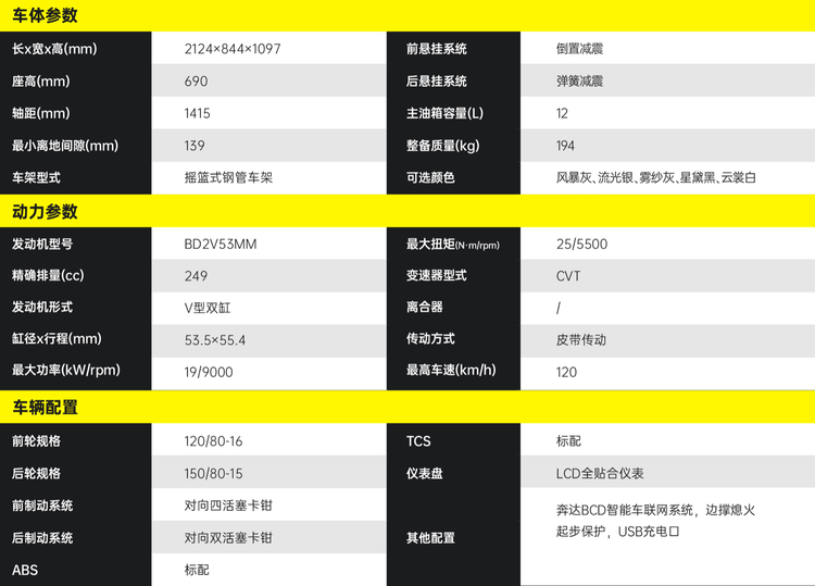 核心配置上,金吉拉250CVT最亮眼的莫过于250cc V缸发动机与CVT无级变速箱的组合,这也是它降低驾驶门槛的关键。249cc V型双缸水冷发动机,最大功率19kW,最大扭矩25N·m,动力输出平顺且低扭充沛,红绿灯起步轻快,日常城市通勤、短途摩旅完全够用,既不会因动力过强让新手难以掌控,也不会因动力不足影响骑行体验,是公认的黄金排量。