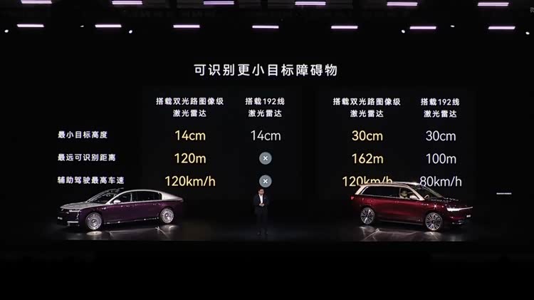 华为D5MAX激光雷达的核心优势,在于其“看得更清、看得更远、看得更全”的超强感知能力,完美解决了当前行业在细小障碍物识别、超远距离预警、复杂恶劣环境感知等方面的核心痛点,其实际表现更能直观体现这份实力。实测数据显示,它能在50多米外清晰识别小狗摇尾巴这类细小动态,即便距离达到120米,也能精准捕捉到仅14厘米高的障碍物——比如路边砖头、掉落轮胎等。相较于市面上主流的192线雷达,其识别距离提升了77%,差距极为显著。技术上,它采用创新双光路架构,配备广角+长焦双激光接收单元,如同为车辆配备了两双互补的“眼睛”,实现视场角与探测距离的双重突破;896线的超高线数更是将精度拉满,推动感知从点云级升级至图像级,扫描画面精细度大幅提升,能捕捉更多环境细节、承载更丰富的环境信息量,大幅提升智驾系统的反应速度和决策准确性。