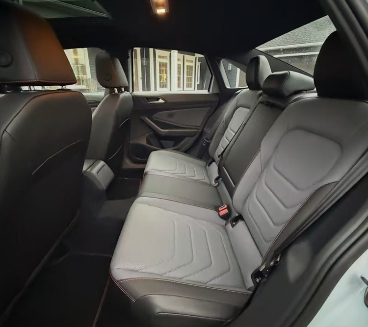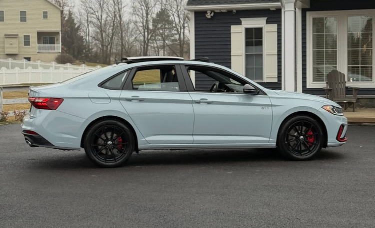 车身侧面2026款大众捷达GLI运用了更加凌厉的线条设计,平直肯硬朗的腰线贯穿前后车门把手,搭配前后轮拱处以及侧裙处的硬朗线条展现了极强的力量感。同时新车还换装了更加运动化的黑色多幅式轮圈,内部还加入了红色刹车卡钳,B/C柱以及后视镜均采用了黑化处理,再加上可开启的天窗,运动感十足。