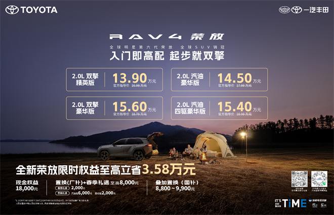 选车看长期,购车在当下,全新 荣放(参数|询价)这次全都安排上。阳春3月, 第六代全新荣放智能电混双擎精英版正式交付,官方指导价16.98万,限时焕新价15.18万元,直降1.8万元。惊喜不止于价格,还有重重福利。2026年3月31日前下订荣放全系并在4月30日前开具发票的用户,即可享受一汽丰田提供的包括春季礼遇和置换补贴在内的至高8000元春日礼。这还不够,用户还可同步享受至高约万元的国家补贴。价格直降1.8万元、厂补至高8000元,再享受国补至高约万元,综合折算,购买全新荣放,真金白银至高立省3.58万元。因此,智能电混双擎精英版实际价格即全新荣放起步价仅为13.9万元。没有套路,没有期货;入门即高配、起步就双擎、上车有TSS 4.0智行安全,且油混同强;购买全新荣放,品质口碑更可靠、长期价值更划算,买车一步到位更省心。