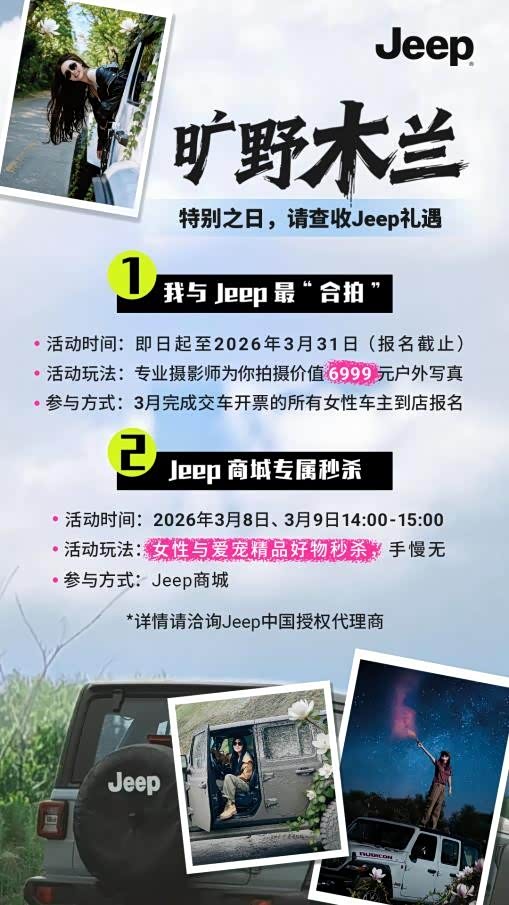 如果你是在2026年3月1日至3月31日期间完成交车的女性车主,从即日起至3月31日,前往购车的Jeep授权经销商处完成报名登记,即有机会受邀参与由Jeep官方特邀专业摄影团队执行的户外大片拍摄。品牌将根据报名情况进行综合评定,并由区域经理在3月中下旬至4月期间陆续通知入选车主,一对一协调具体的拍摄时间与地点。整个拍摄计划预计于4月底前执行完毕。拍摄完成后约15个工作日内,你将收到由专业团队打造的精修大片与专属电子相册,永久留存你与Jeep在旷野中的高光瞬间。