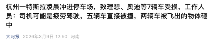 根据《大河报》报道,3月9日凌晨,杭州秋石高架下方的一处地面停车场突发意外,一辆特斯拉轿车从路边径直冲破停车场入口道闸,径直撞向场内停放的多辆车辆,现场一片狼藉。