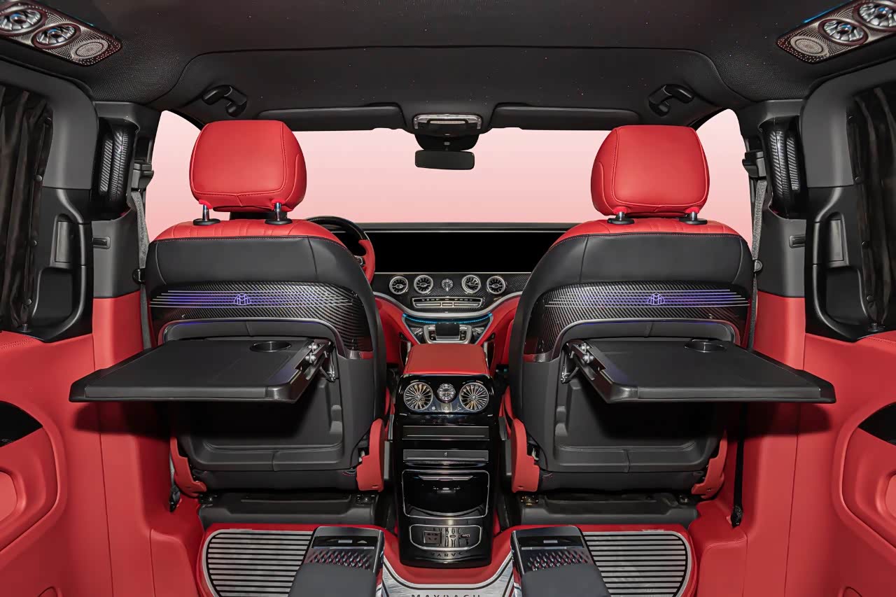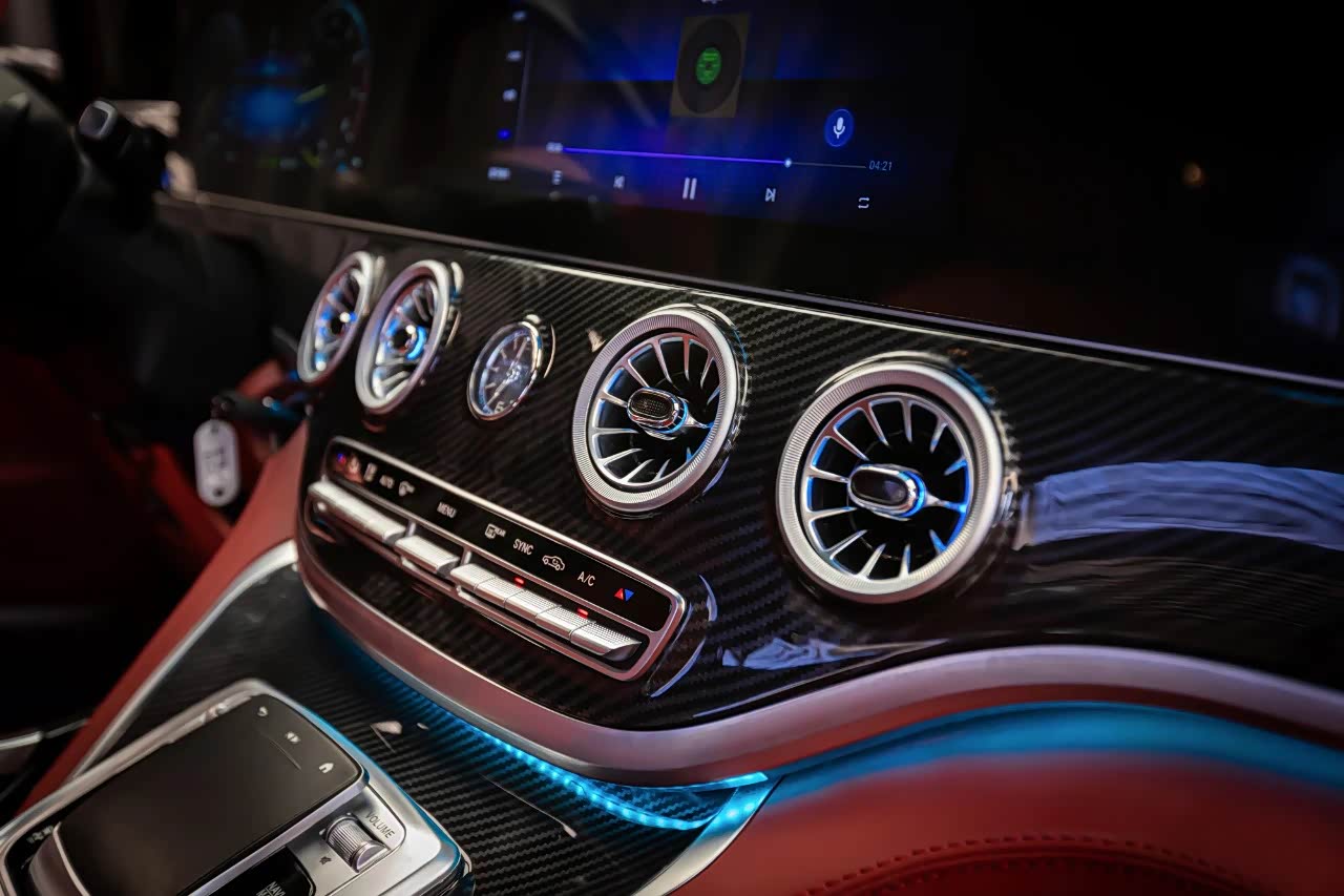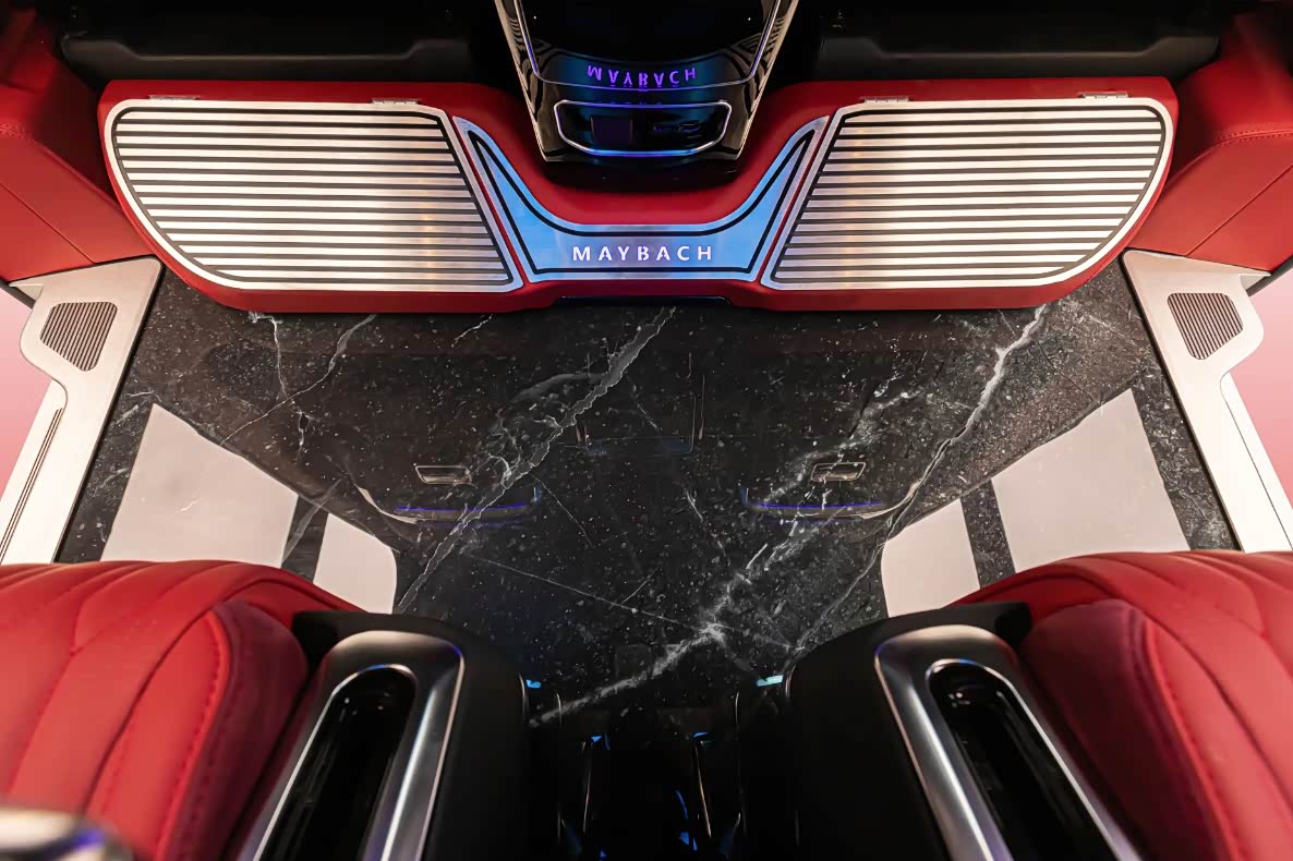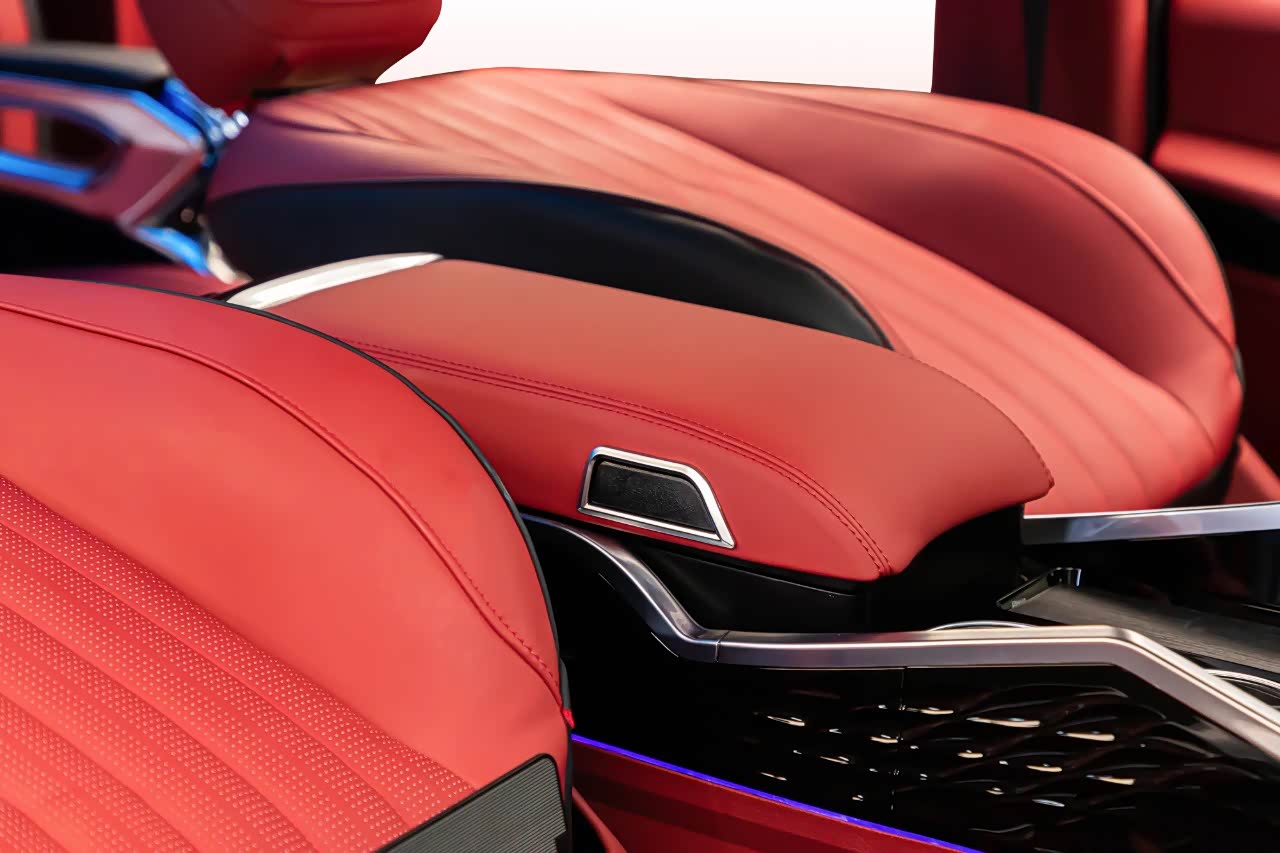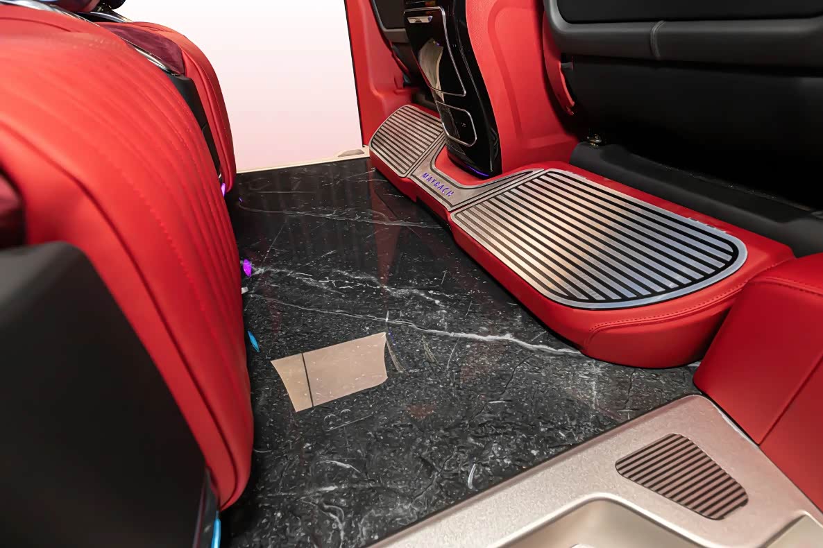 全车内饰核心用拉丝纳帕皮革做包覆,包括前排2座、仪表台上下层、中央通道、4门门板甚至尾门,红黑撞色的版型精准到每一处缝隙,安装时特意要求师傅对齐皮革纹理,避免后期起皱。替换的迈巴赫星际款三屏仪表台,直接把原厂的机械仪表换成液晶三屏,科技感瞬间拉满,而且和红黑内饰的适配度很高,不会显得突兀。