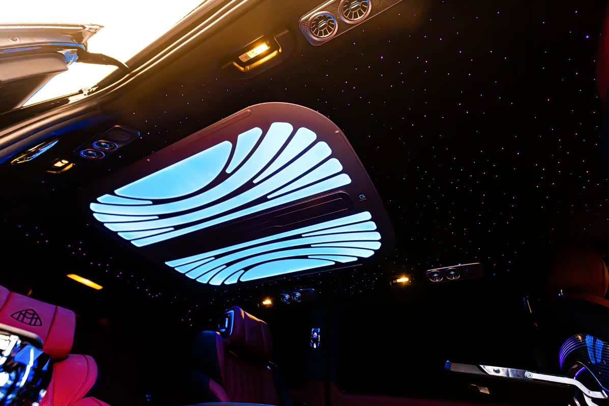 外观上最亮眼的是王者高山流水包围,线条不像普通包围那样生硬,流水状的镀铬饰条让威霆瞬间摆脱“街车感”;搭配的TBZ004-V1T1激光款流星雨大灯,夜间照射距离比原厂远30%,接待客户晚归也更安全。氛围配置里,**劳斯莱斯星空顶(含流星雨)**是车主最满意的,晚上打开后,后排客户都忍不住拍照;星际款顶灯、前门发光喇叭罩、6个带灯顶棚拉手,哪怕是开门上车的瞬间,仪式感都到位。