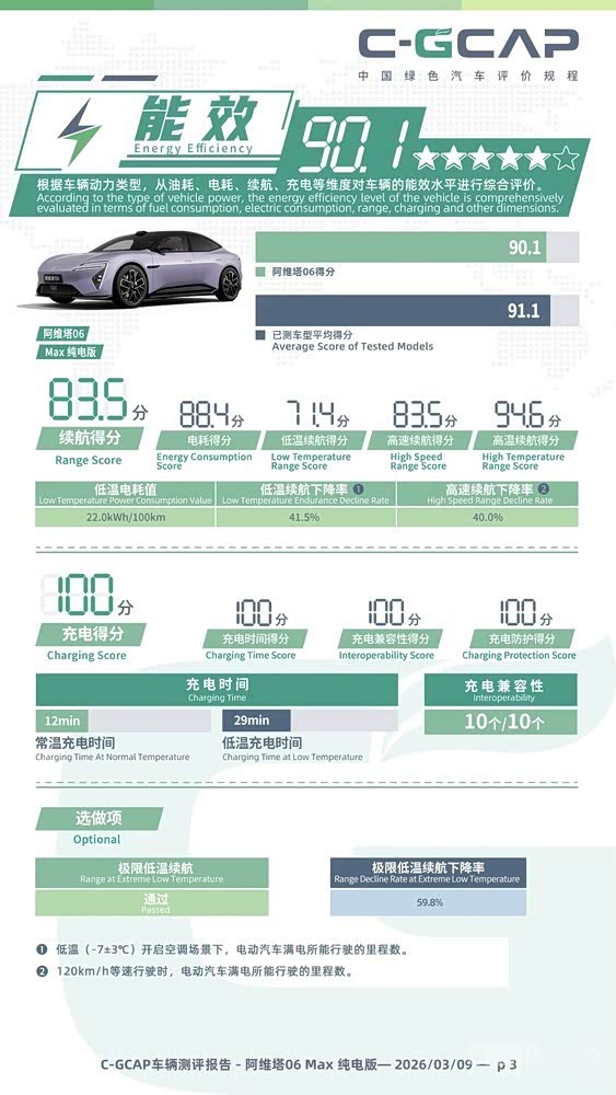 在能效维度,阿维塔06 Max纯电版综合得分90.1分,涵盖续航、电耗、充电等细分项。
