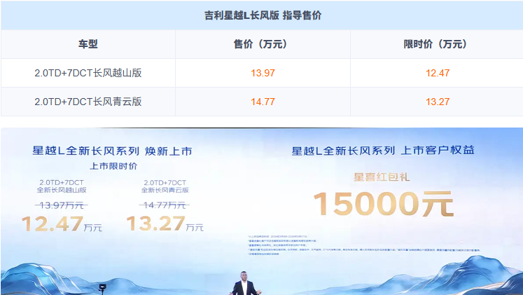 车家号·0浏览·2026-03-10 12:22 · 广东吉利星越L长风系列正式上市,限时12.47万起的价格,直接将2.0T动力和满配体验拉进13万级,竞争力拉满。