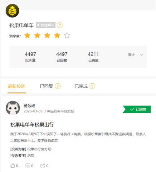 黑猫投诉平台显示,截至3月9日,松果电单车共计有投诉量4497条,已完成4211条,近30天投诉量166条,消费者投诉问题包括多收费、自动扣费、不退款、售后服务等。