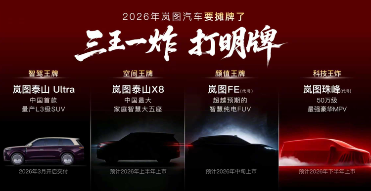 2026产品大年持续深化,根据规划,2026年岚图将推出四款全新车型,包括中国首款量产L3级SUV岚图泰山Ultra、“庭院级大五座SUV”岚图泰山X8、智慧纯电FUV(代号FE)以及50万级高端MPV(代号珠峰),产品阵容将拓展至6-9款车型。全系车型均将搭载L3级智能辅助驾驶硬件,实现“技术普惠”的进一步落地。