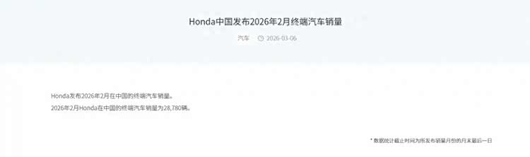 2026年2月,本田在华销量只卖了28780台,同比大跌15%。
