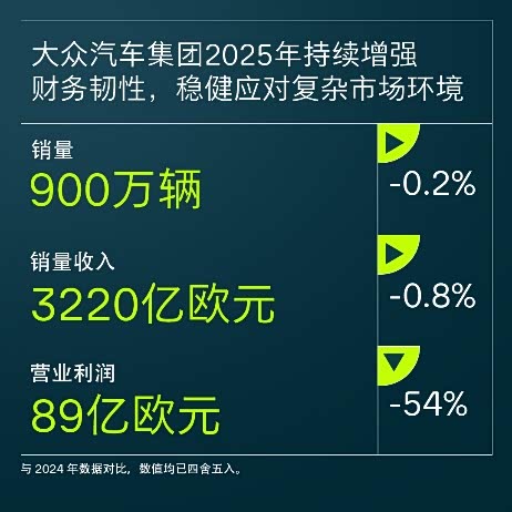 面对充满挑战的市场环境,2025年,大众汽车集团实现销售收入3219亿欧元,与2024年(3247亿欧元)相比保持稳定。