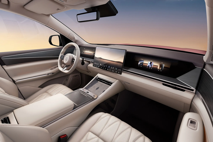 从最新公布的内饰效果图来看,大唐倒是没有在中控布局与内饰上搞太多特立独行的创意。中控台整体还是比较简洁的,但它还会实现对称式三实体屏布局,并在娱乐上提供了支持7.1.4声道的27扬声器帝瓦雷环绕音响+二排吸顶屏、在氛围上布局中空夹层全景天幕、在便捷上提供二排双折叠小桌板+智能冷暖箱等等。在不考虑细节升维的情况下,它跟问界M9之间其实并没有纸面上的明显差距。