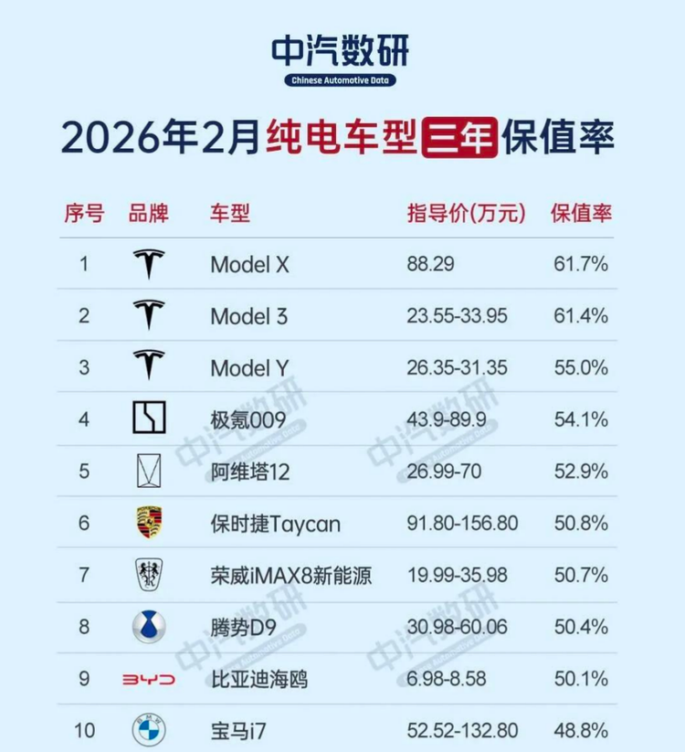 在纯电领域,紧随问界M9之后的是极氪009(81.6%)和理想MEGA(80.8%)。这三款定位高端的车型构成了保值率的第一梯队。相比之下,特斯拉Model Y和Model 3分别以79%和78%位列四、五位;而备受关注的小米SU7则以76%的保值率排名第七。