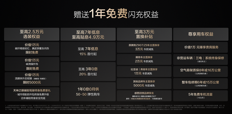 金融方案灵活多元,提供至高7年低息、15% 首付起的长期方案,也有至高3年0息、20%首付起的省心方案,还有1年0息0月供的50-50弹性购车方案可选,大幅减轻购车资金压力。置换补贴诚意更是直接拉满,原腾势Z9GT/Z9车主置换补贴至高3万元,除此之外的腾势车主补贴2万元,比亚迪、奔驰车主置换补贴1 万元,其他品牌车主也可享受5000元置换补贴,加上价值1万元的臻享贵宾服务,首任非营运车主享三电终身保修,空气悬架8年或16万公里质保,整车6年或15万公里包修等用车权益,全生命周期守护用车生活。
