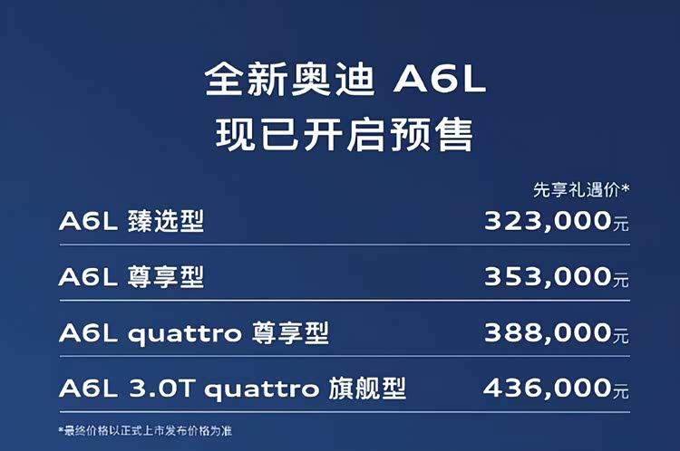 近日,C9代 一汽奥迪A6L(参数|询价)正式开启预售,此次预售最引人关注的两大亮点,一是预售价格大幅下调,二是在新能源车型普及、大排量发动机逐渐稀缺的当下,依旧保留了3.0T V6发动机动力版本,既降低了豪华中大型轿车的入门门槛,也满足了部分消费者对大排量动力的需求。根据官方公布的预售信息,新车共推出4款车型,预售价区间为32.3万至43.6万元,相较于现款车型42.79万至55.89万元的指导价,入门价直接下调超10万元,降幅十分明显,即便和现款车型终端优惠后的价格相比,也具备十足的竞争力。