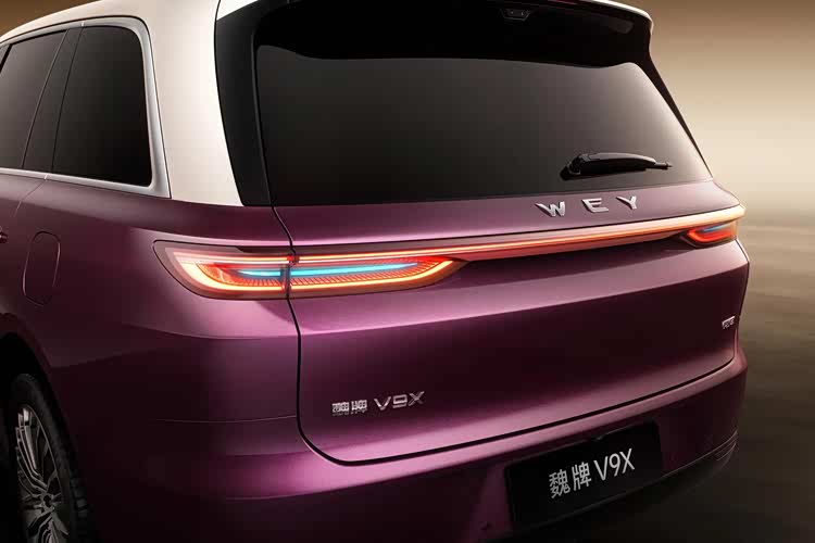 车尾方面,魏牌V9X同样使用贯穿式尾灯造型,带有辅助驾驶小蓝灯。作为插电混动车型,魏牌V9X弱化了排气造型,使用隐藏式排气布局,尾部牌照安装区位于后保险杠之上。