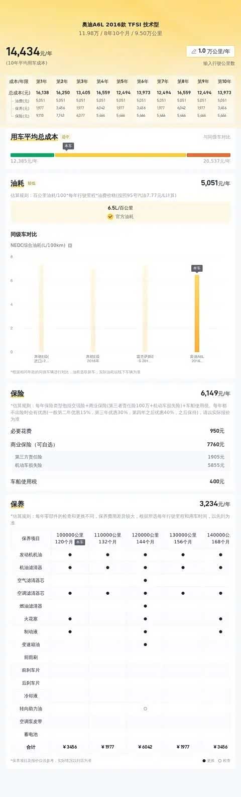 接下来,我们来详细分析这款汽车的使用成本。根据数据显示,在百公里油耗为6.5L的情况下,预计每年的燃油费用大约为5665元(假设每年行驶距离为1万公里)。关于保险方面,预计的年保费约为5106元,涵盖了交强险、商业第三者责任险(保额高达一百万)以及不计免赔的特别险种。此外,车辆保养也是用车成本的一部分,预计每年需要支付约3375元的保养费用。然而,这些费用仅为估算值,实际费用可能会因保险政策、保养项目和个人驾驶习惯等因素有所调整。