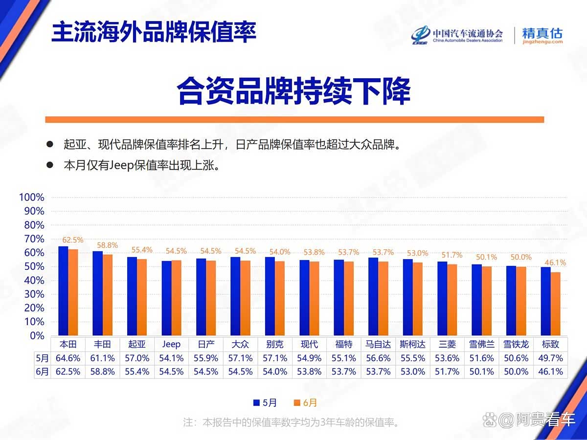 整体来看,合资品牌保值率持续下滑,仅有Jeep保值率出现上涨,日韩品牌表现突出。从排名上看,起亚、现代保值率上升,日产品牌超过了大众品牌。
