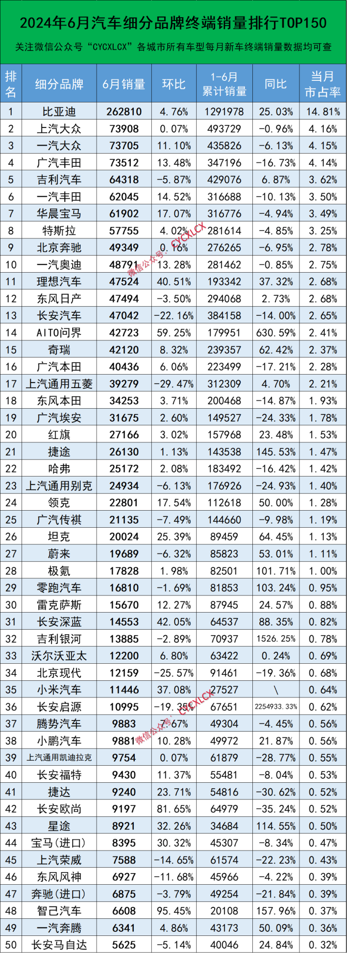 近日,乘用车销量查询公布了2024年6月汽车细分品牌终端销量排行榜。数据显示,6月国内乘用车销量达到了177.5万辆,比去年同期下降了8.5%,环比上月增长了4%,与5月相比有78个细分品牌实现正向增长。